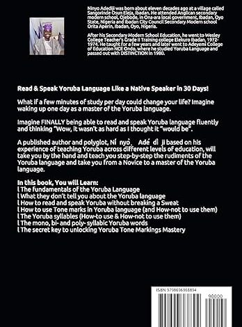Pick up your copy today by clicking the BUY NOW button at the top of this page! In Yoruba for beginners, Ninyo Adediji gives you a simple step-by-step lessons that will help you learn and speak Yoruba with ease! If you have always had a dream to be able to speak, read and bond with Yoruba family and friends, then this book is your best best to achieving your dreams.